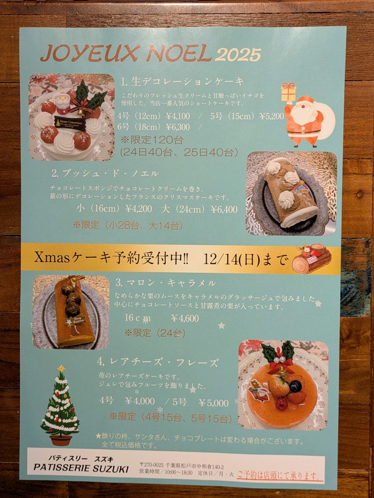 12月にご注文いただけるホールケーキは、定番メニューの4種類に限定させて頂きます。 ★生デコレーション ★チョコデコレーション ★フルーツタルト ★スフレチーズケーキ 12月20日(土)・21日(日)・24日(水)・25 …